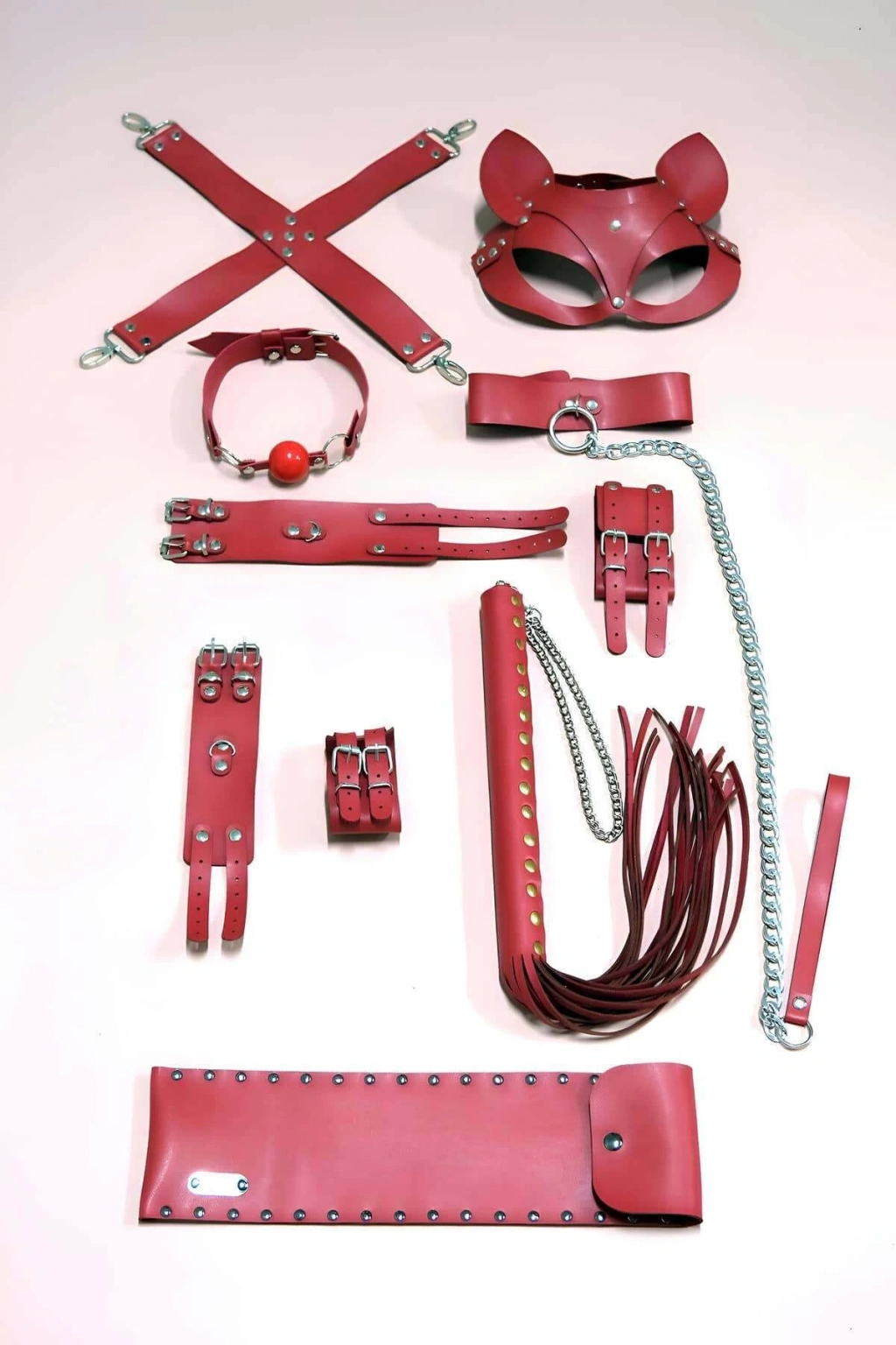 • Ürün ve paket içeriği: 7 parça (Kırbaç ve kırbaç kılıfı, el kelepçe takım, ayak kelepçe takım, tasma, ağız topu, kedi maske ve X bağlama aparatı)