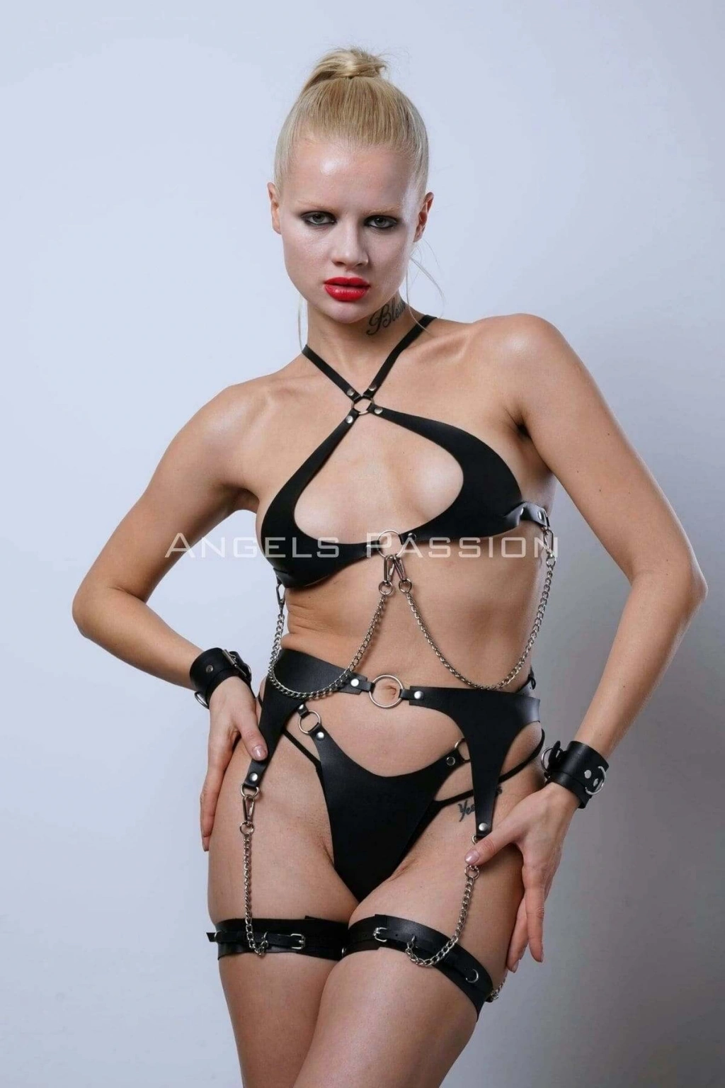 Deri Jartiyer Takım, Zincir Detaylı Şık Fantezi Takım, Deri İç Giyim - APFT1219