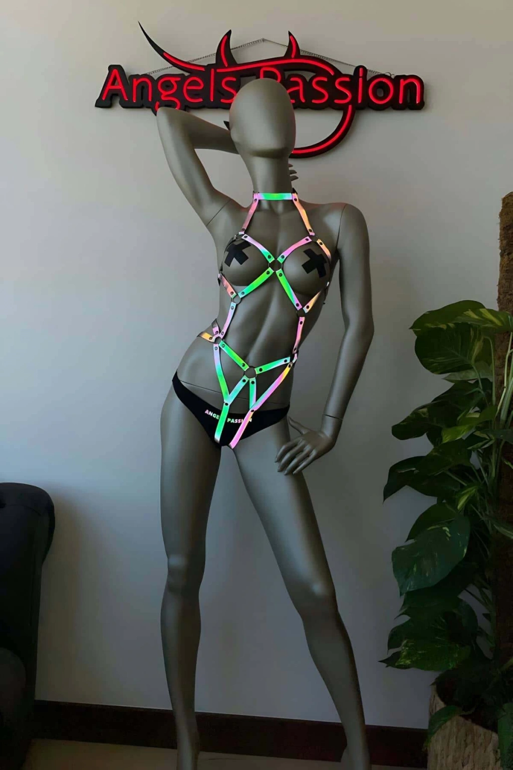 Dünya’da ilk kez Angels Passion markası tarafından üretilen Erotik İç Giyim Reflektörlü Seksi Body Harness isimli Reflektörlü Harness ürünümüz, ışık vurduğunda parlayan özel üretim reflektörlü malzemeden hazırlanmıştır.
