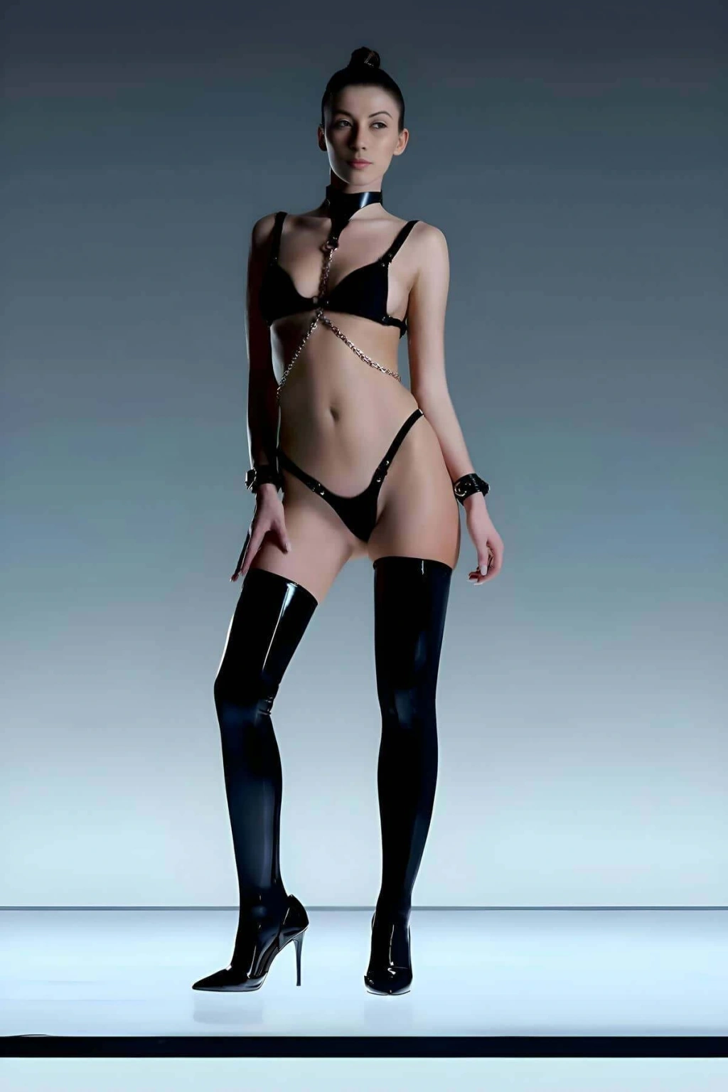 • Ürün ve paket içeriği: 5 parça (1 ad. Zincirli Harness , 1 ad. Deri Sütyen , 1 ad. Deri Tanga , 2 ad. Bileklik ) Tayt çorap dahil değildir.