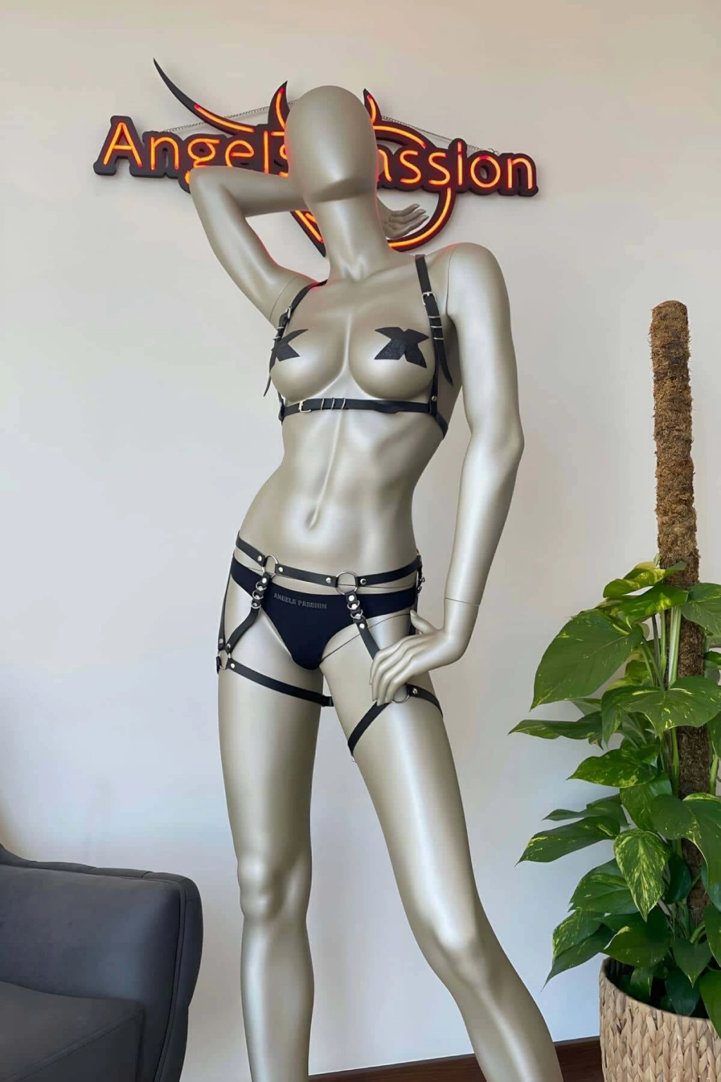 Kelepçeli Şık Deri Harness Takım, Kadın Fantezi Giyim - APFT869