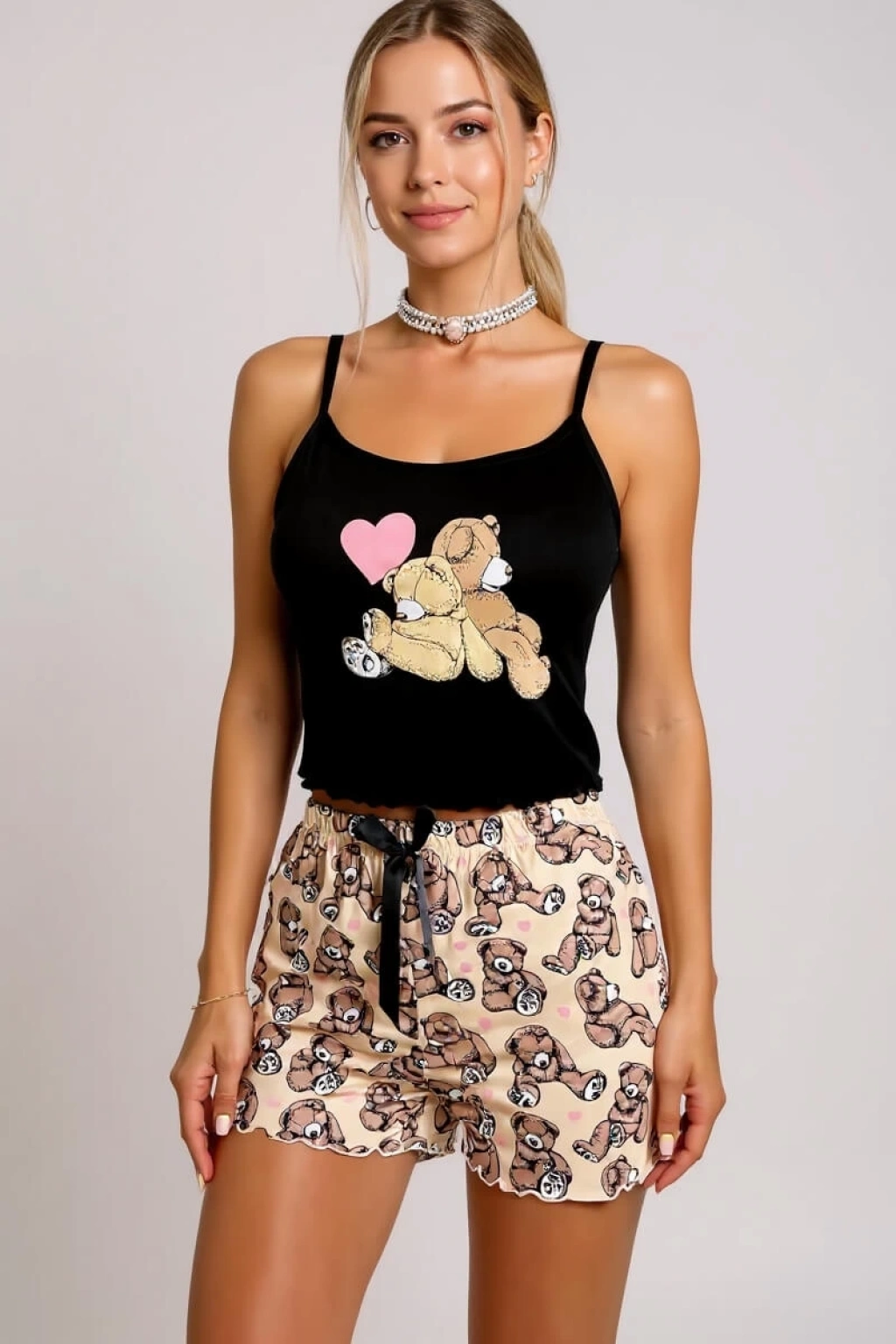 Renkli Ayıcık Desenli Askılı Şortlu Kadın Pijama Takımı