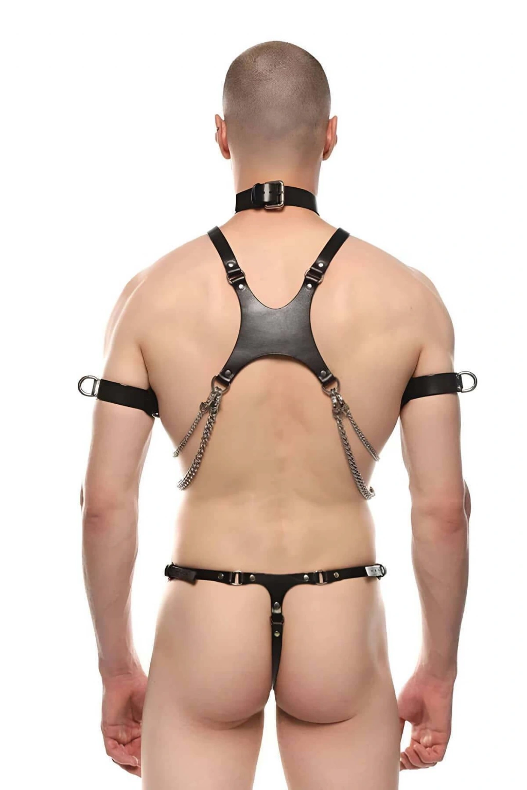 • Ürün ve paket içeriği: 4 parça (1 ad. Deri Göğüs Harness , 1 ad. Tanga , 2 ad. Kol Bandı)